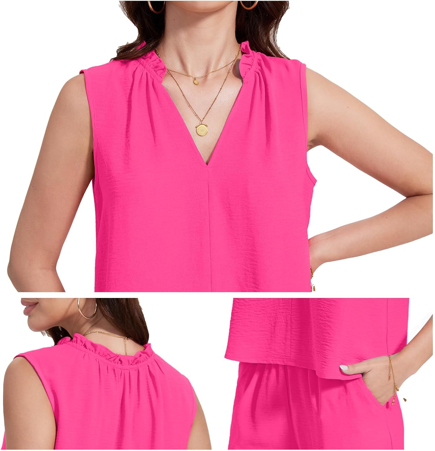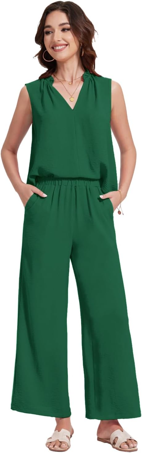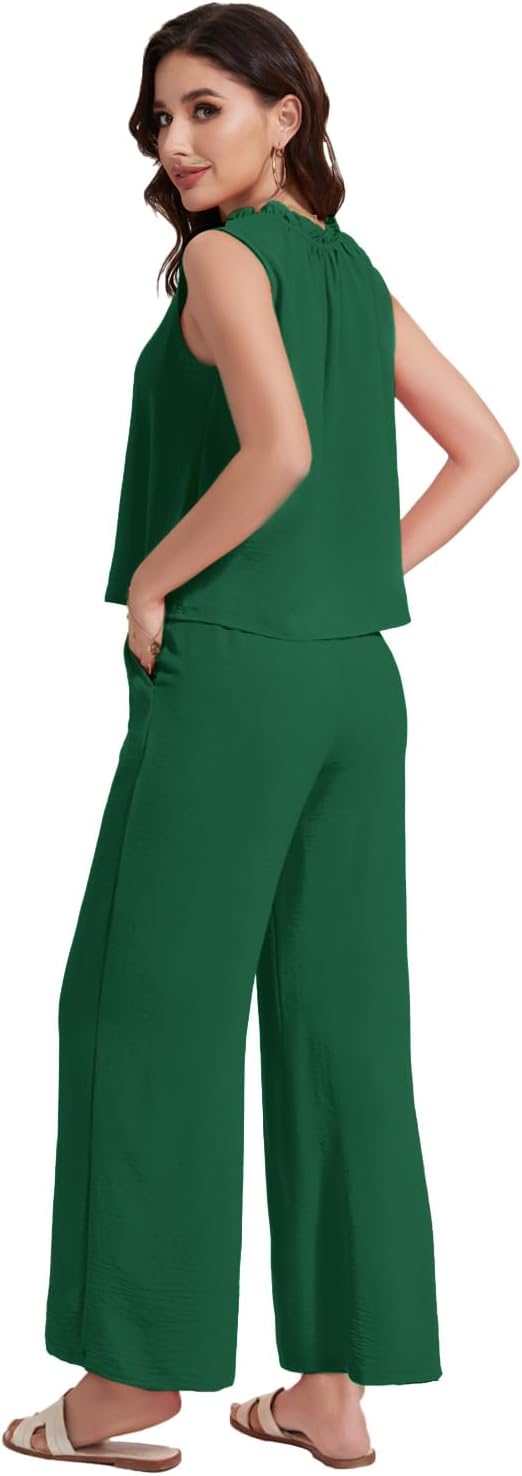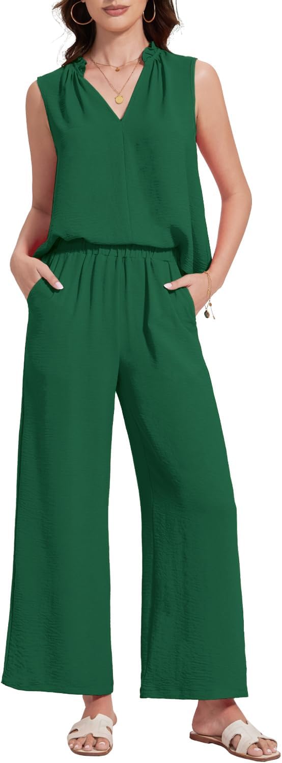 This Women's summer two piece sets with a small ruffle along the top edge -a breezy silhouette that is perfect for warm weather days.The summer sleeveless sweatsuits with a charming ruffle detail around the neckline, elevating your casual ensemble. Stylish and cozy, this V-neck pullover features a flowy design that will have you looking great any time of day.